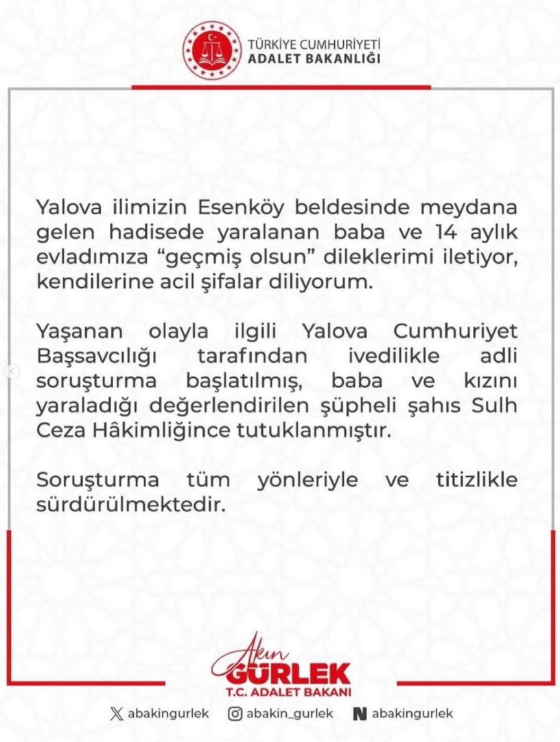 Bakan Gürlek açıklamasında şu ifadelere yer verdi: “Yalova ilimizin Esenköy beldesinde meydana gelen hadisede yaralanan baba ve 14 aylık evladımıza ‘geçmiş olsun’ dileklerimi iletiyor, kendilerine acil şifalar diliyorum. Yaşanan olayla ilgili Yalova Cumhuriyet Başsavcılığı tarafından ivedilikle adli soruşturma başlatılmış, baba ve kızını yaraladığı değerlendirilen şüpheli şahıs Sulh Ceza Hâkimliğince tutuklanmıştır. Soruşturma tüm yönleriyle ve titizlikle sürdürülmektedir.”